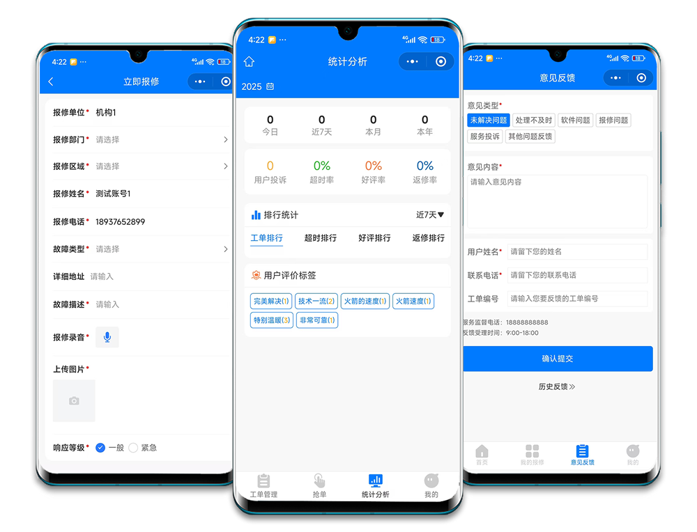 支持微信、小程序、APP、后臺等平臺報修